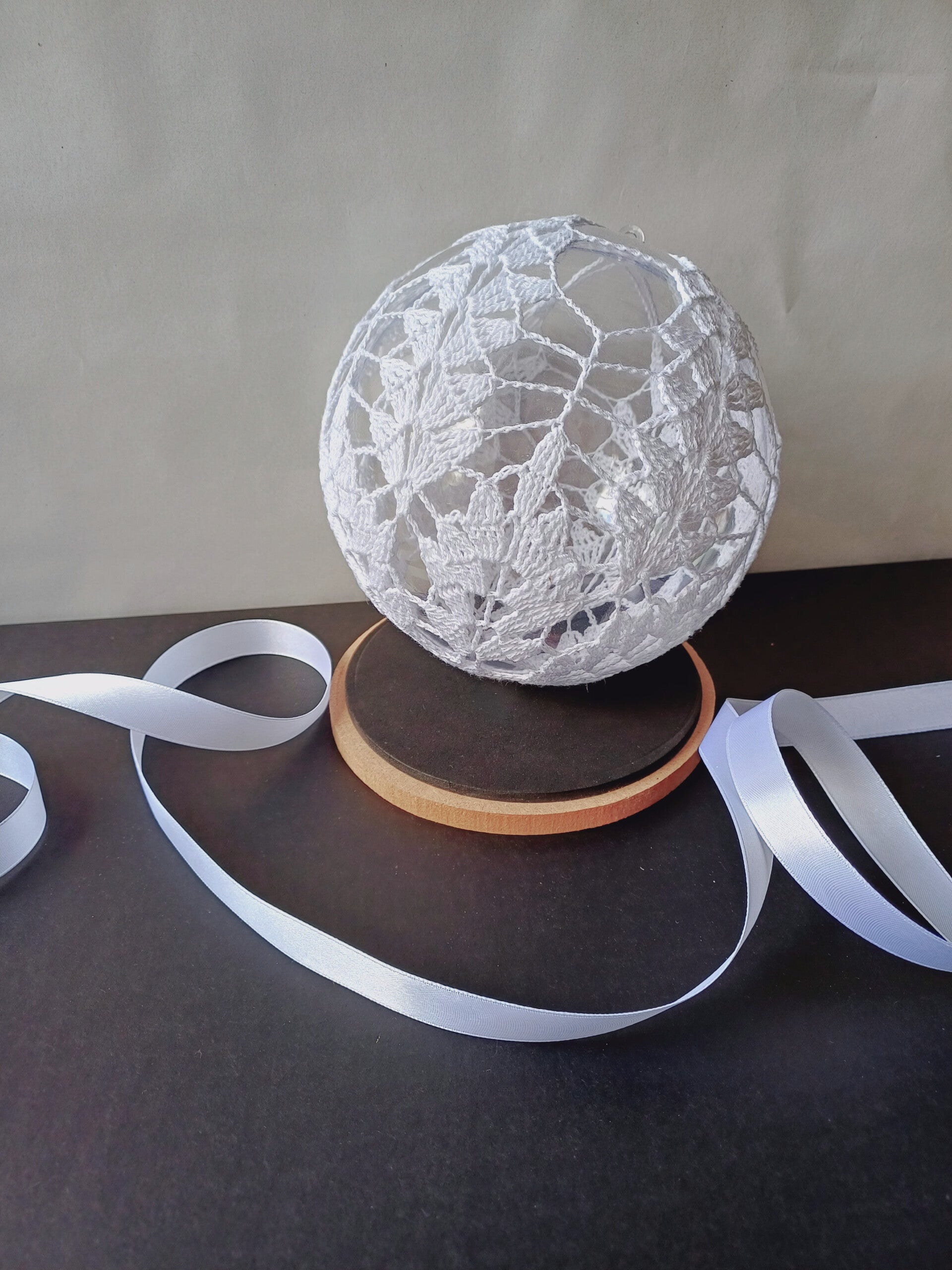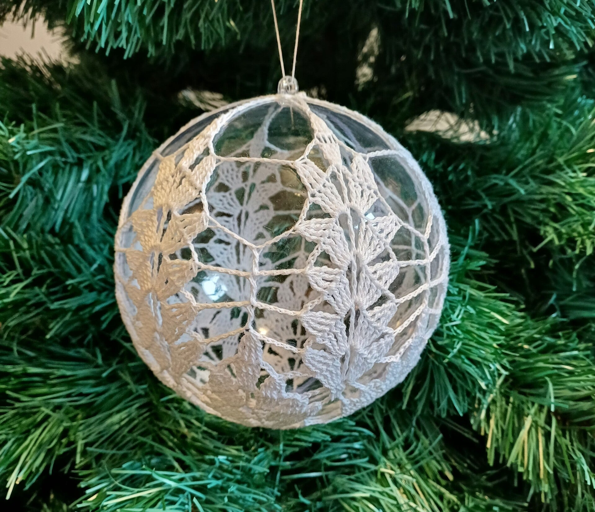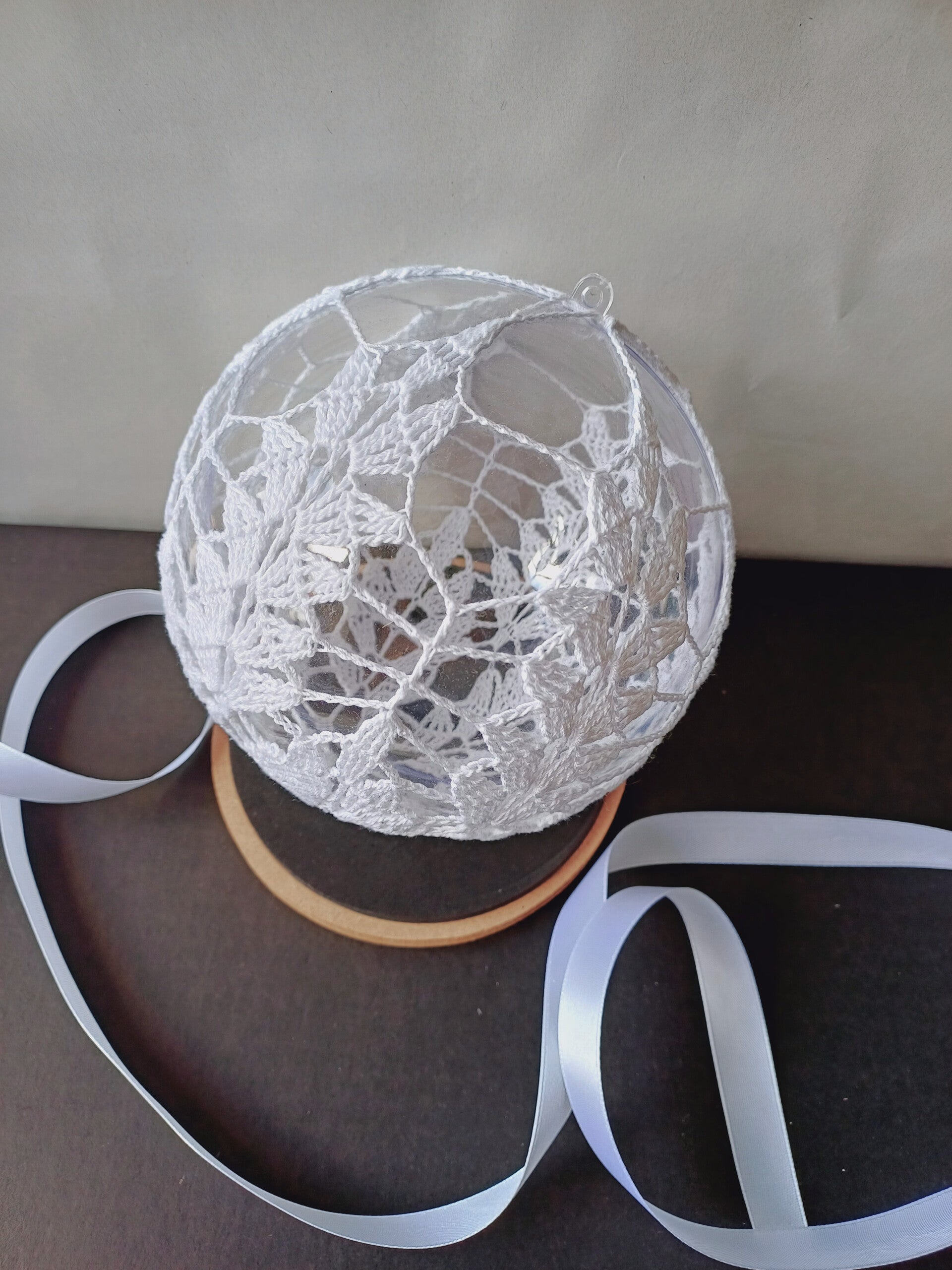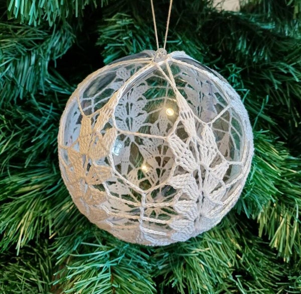 Transparentna kula została ozdobiona misternie szydełkowaną koronką w delikatny wzór liści, który pięknie rozprasza światło i nadaje dekoracji lekkości oraz naturalnego uroku.